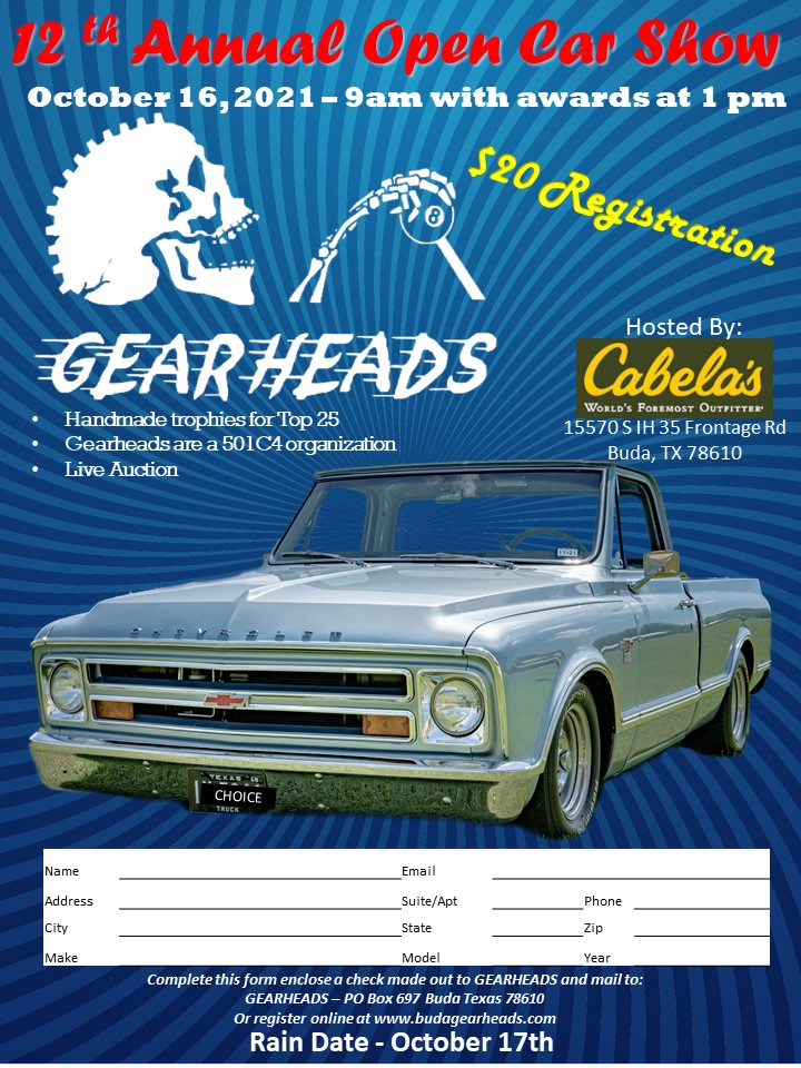 The Buda Gearheads put on an annual open car show every October. Join us this year at Cabela's in Buda Texas on Saturday OCTOBER 16, 2021. *Transaction fee included